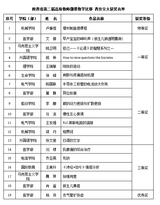 近日,陕西省第二届高校教师微课教学比赛结果揭晓,我院卢秉恒院士的《增材制造微课程》荣获此次比赛唯一一项特等奖。西安交通大学获得特等奖1项,一等奖5项,二等奖7项,三等奖5项,优秀奖1项。参赛获奖总数位居全省...