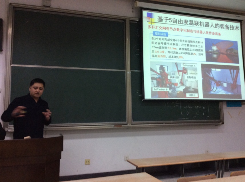 11月12日,天津大学机械工程学院刘海涛副教授应高端制造装备协同创新中心邀请,开展联合授课活动。 刘老师以《并联机器人及其工程应用》为题,生动地向同学们讲述了并联机器人的构型特征、发展历史、5自由度混联机器...