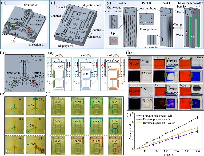 针对上述问题,西安交通大学机械工程学院张辉副教授团队提出了基于最小作用原理(最小能量法)的高曲率弓形边缘设计方法,获得了不同条件下的最优阻碍弓形曲线,从能量角度揭示了弓形边缘对于液体在沟槽内的最大阻碍作用机理,并提出了不同接触角下弓形曲线设计方法与准则。该研究揭示了2016年以来学界未能解释的弓形结构对流体作用机理问题。基于上述理论,研究团队设计并构建了多种功能性微流控器件,包括Y型分支通道、流体数字显示器和油水分离器。其中,Y型分支通道能够利用接触角差异实现液体在支路间的选择性分流;流体数字显示器通过不同液体在不同通道中的路径走向,形成不同的数字图案显示;油水分离器依靠弓形边缘的润湿差异实现无外场高效油水分离,其5分钟分离效率可达约98%。该研究为微流控系统中液体的定向输运、多向调控及智能筛分提供了新的结构策略与设计思路。