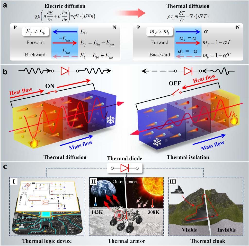针对这一关键问题,西安交通大学机械工程学院洪军教授、李宝童教授团队首创了基于异质材料协同热膨胀的“热p-n结”物理模型,通过构建定向质量场成功实现了宏观热二极管。该研究建立了热学系统中“定向质量场”与电学中“内置电场”的理论对应关系,揭示了正/负热膨胀材料协同作用下产生的净质量流对系统热导率分布的调控机制,从而打破热传递的空间反演对称性。基于此理论突破,团队受曼陀罗花螺旋生长启发,设计了具有四重旋转对称性的仿生手性超材料单元,将等效热膨胀系数提升至基体材料的7.7倍,并通过引入“可变域边界”,在303-393 K的宽温区内实现了理想热整流效应(整流比η=1)。基于该原理设计的热二极管展现出卓越的性能:在正向传热时,热流密度高达19232 W/m²,系统呈现高效导通状态;而在反向传热时,热流被抑制至接近零值,表现出近乎完美的阻断特性。该研究不仅解决了宏观尺度非互易热传递的实现难题,更为热逻辑器件、智能热防护装甲和热隐身技术等前沿应用提供了新的设计范式与解决方案。