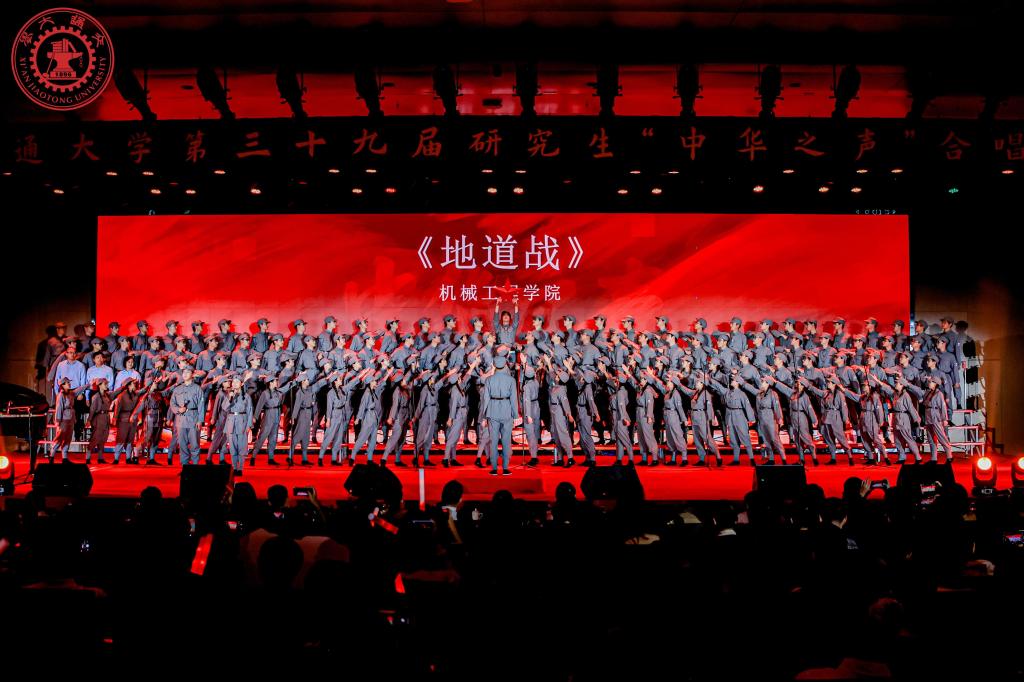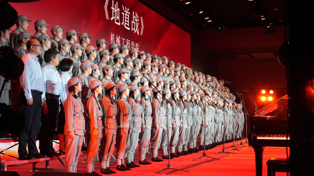 比赛当天,机械工程学院合唱团以一首《地道战》震撼开场。雄浑有力的歌声仿佛将观众带回了那个烽火连天的年代,军民利用地道与敌人周旋的智慧与英勇历历在目。舞台上,师生们默契配合,张俊斌书记、张敏副书记、周光辉副院长站在学生中间共同高歌,展现了跨代际的文化对话与情感共鸣。