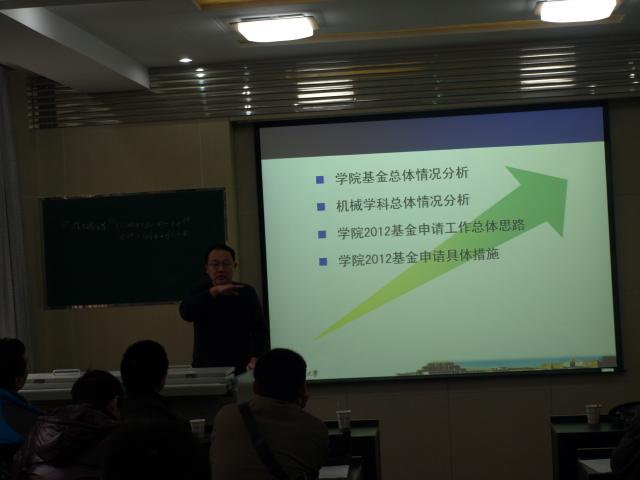 12月27日下午,机械学院召开2012年国家自然科学基金申报动员会议。会议邀请了校科研院王文副处长、董康宁老师总结2011年学校及机械学院基金申请工作和项目情况,并对2012年基金申报政策进行了解读。徐光华副院长在会上作了动员,各所长、中心主任及相关教师40余人参加会议。
