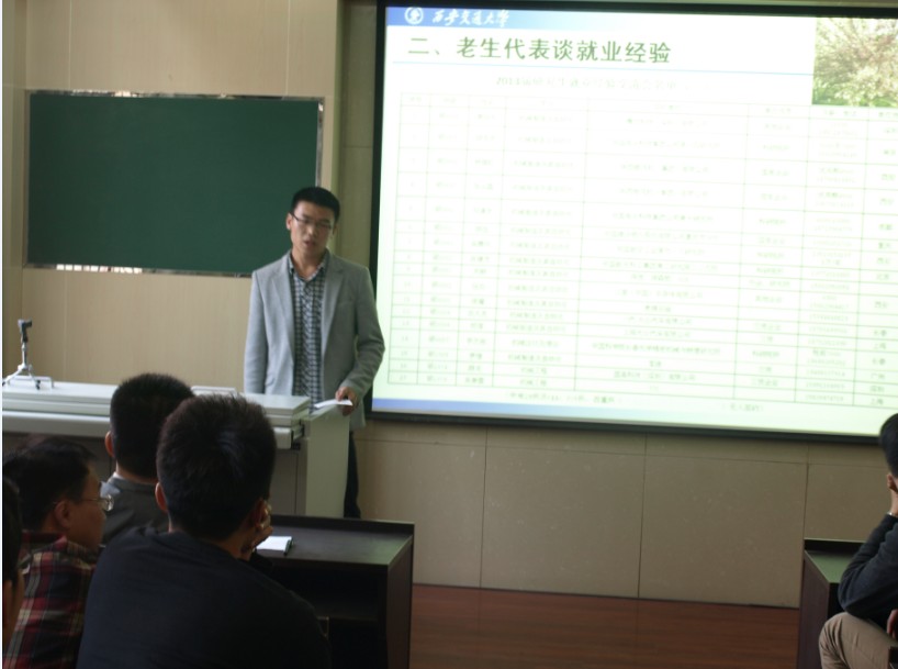 在交通大学电气机械学科将迎来百年华诞之际,2013年3月27日下午,机械工程学院2013届研究生就业经验交流会在机械工程学院第三会议室成功举行。15位2013届毕业研究生和百余人低年级研究生齐聚一堂,会议由机械工程学院研工办雷励老师主持。