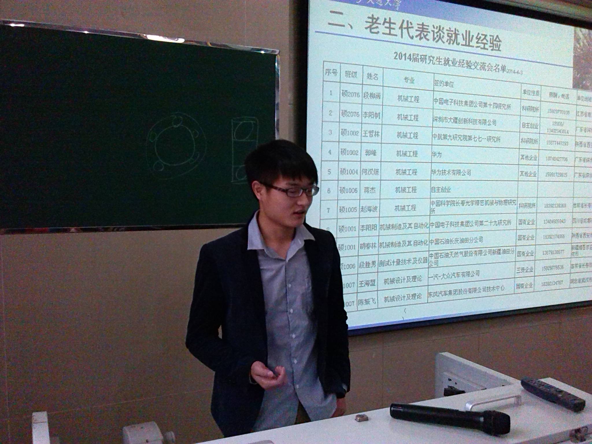 2014年4月3日上午9时,机械工程学院2014届研究生就业经验交流会在机械工程学院第三会议室成功举行。12位2014届毕业研究生和百余人低年级研究生齐聚一堂,出席本次会议的有机械工程学院党委副书记杨鹏老师、机械工程学院研工办雷励老师,会议由雷励老师主持。