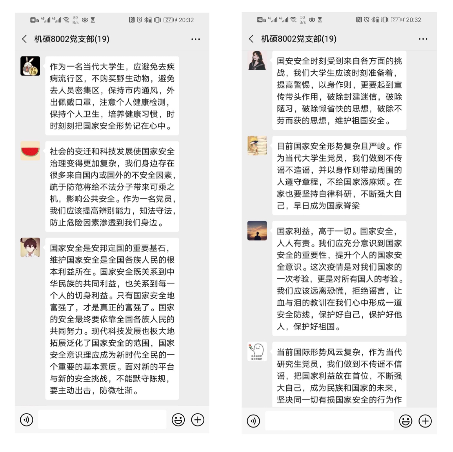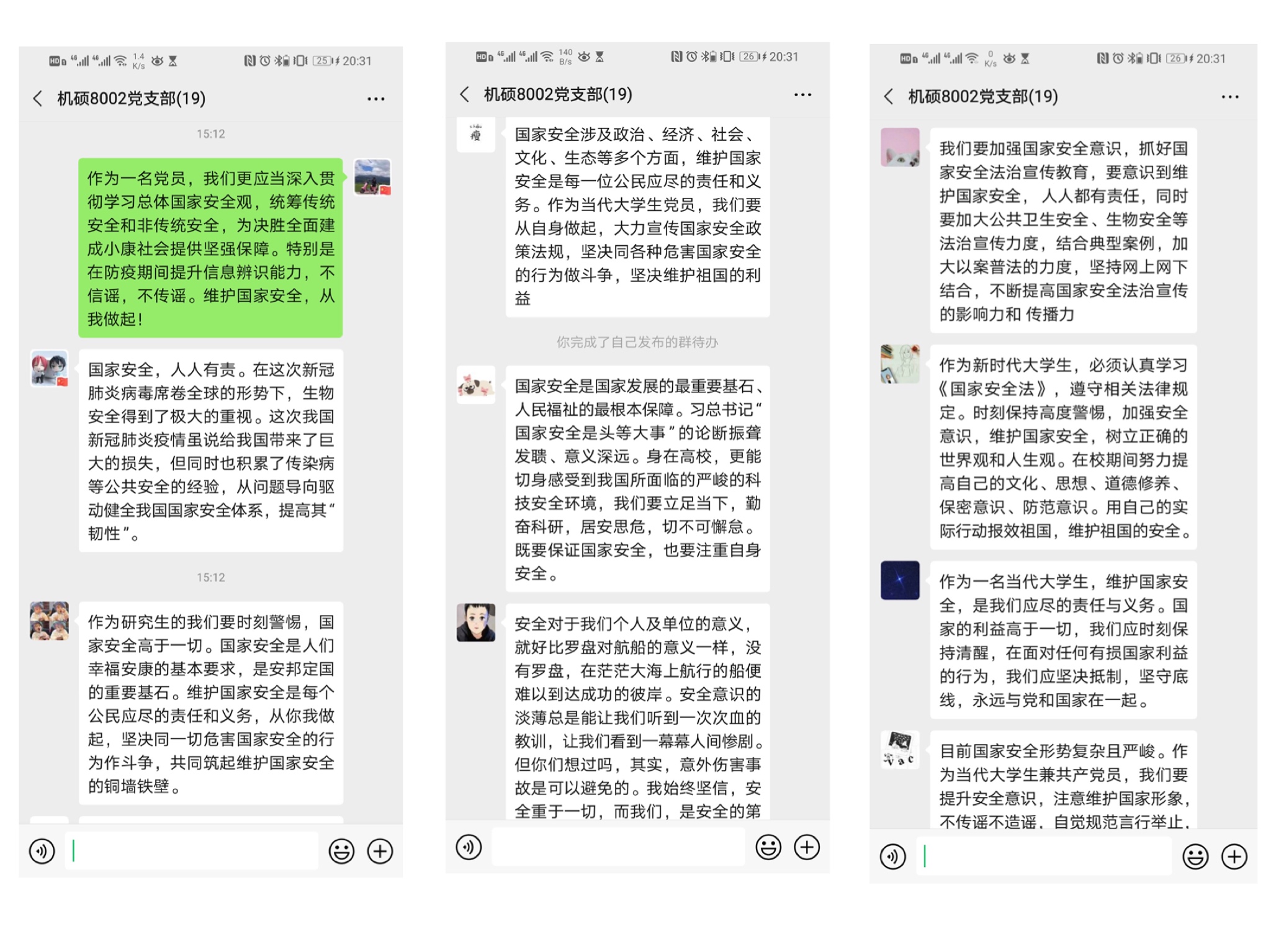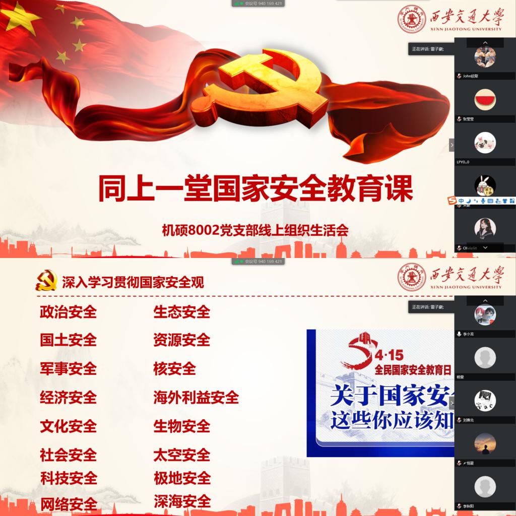 2020年4月15日下午14:00,西安交通大学机械工程学院硕8002班党支部通过腾讯会议及微信群开展了主题为“同上一堂国家安全教育课”的线上党组织生活会,会议由党支部书记雷子豪主持。