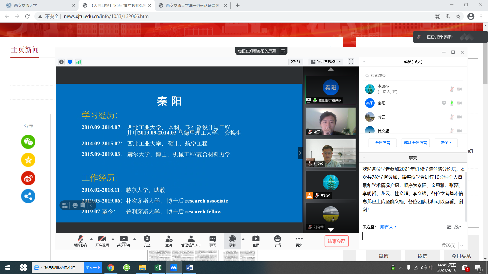 4月16日下午,第七届“丝绸之路青年学者研讨会”机械分论坛以线上方式召开。来自海内外不同国家的青年学者、学院青年人才及各相关领域的团队负责人通过网络会议“见面”、交流。机械工程学院院长陈雪峰教授主持会议。
