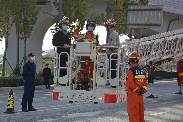 随后,创新港消防站展示了双干线出三只水枪灭火救援操练和YT53型云梯消防车,并邀请部分同学体验了消防救援云梯。
