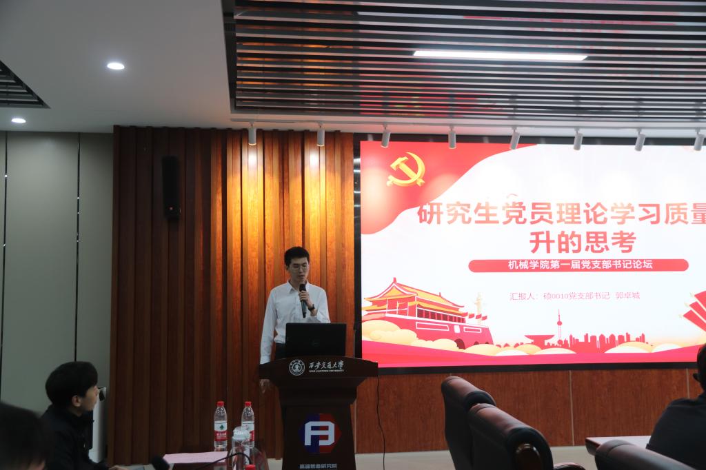 为深入学习宣传贯彻落实新时代中国特色社会主义思想,常态化长效化开展党史学习教育,增加历史自信、增进团结统一、增强斗争精神,以优异的成绩献礼党的二十大,传承弘扬西迁精神,高扬“四面旗帜”,进一步挖掘和凝练基层党组织建设中的好经验、好做法,加强经验交流、集思广益破解工作中遇到的困难和问题,切实加强研究生党支部书记队伍建设,扎实提升党建创新工作水平,充分发挥党支部的战斗堡垒作用,4月26日下午14:30,机械工程学院第一届党支部书记论坛在创新港二号巨构2-5008会议室举行。
