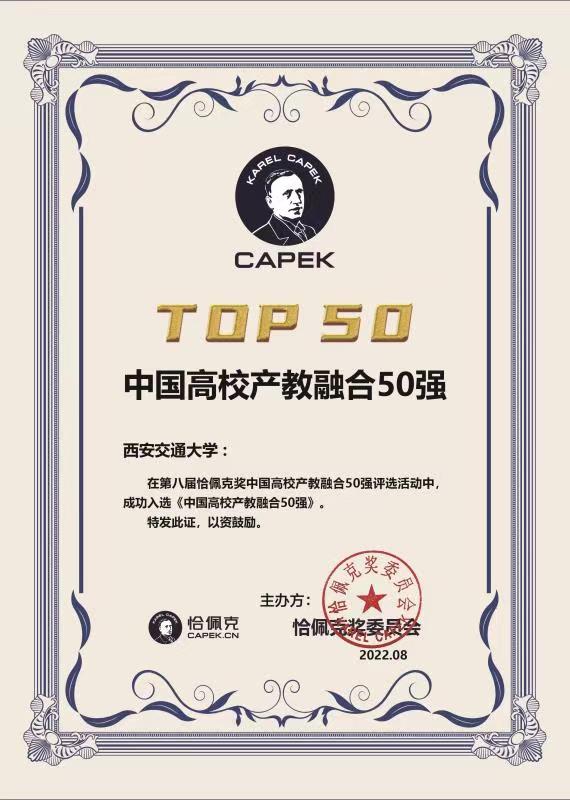 2022年8月25日到27日,第八届恰佩克奖颁奖仪式暨第十二届中国国际机器人高峰论坛在安徽芜湖成功召开。大会由安徽省经信厅、中国机电一体化技术应用协会和芜湖市人民政府共同主办。本届恰佩克奖评委会基于大量数据和事实的严格审核和分析,从113所国内入围高校中,评出了“中国高校产教融合50强”奖项,西安交通大学成功入选。