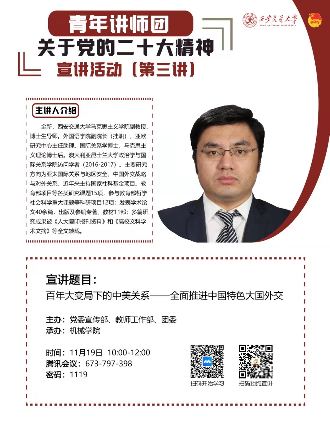 11月19日上午,机械工程学院党的二十大精神宣讲活动在线上举行。学院本科生、研究生党支部书记、委员,学院党建办成员、力行宣讲团成员等240余人参加活动。学校青年讲师团讲师、马克思主义学院副教授、博士生导师作“百年大变局下的中美关系 全面推进中国特色大国外交”主题宣讲报告。学院党委组织员包凯主持活动。