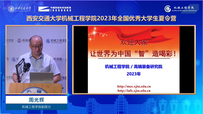 周光辉副院长首先代表机械工程学院全体教职工对来自全国各地的优秀学子表示了热烈的欢迎,并详细介绍了机械工程学院的基本情况及综合实力。周院长指出,在过去的百年时光里,机械工程学院创造出了无数个令人瞩目的辉煌时刻,培养了以人民科学家钱学森为代表的20多位两院院士以及数以万计的优秀人才,希望各位同学通过此次夏令营,更全面深入的了解机械、也欢迎大家加入西交机械人的大家庭。