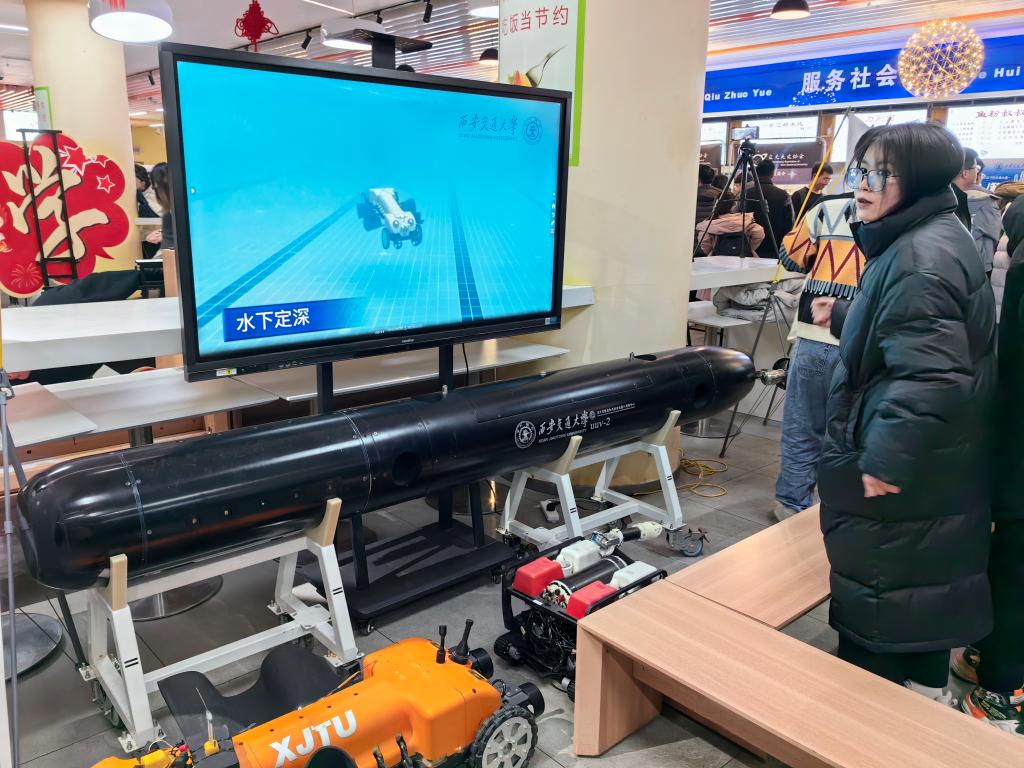 机械学院开展爱的抱抱、扭扭棒创意坊、踢毽子、书写新年心愿等游戏活动,通关游戏即可参与抽奖环节,奖品种类丰富,数量充裕。并设置水下机器人展示区,展现机械学科魅力。