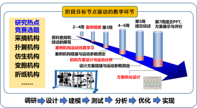 由金悦研究员、桂亮研究员和郭婷高级工程师组成的《机械设计基础》实验教学团队,在理论课程重构和大幅压缩课时的背景下,打破传统实验依附于课程的传统,从学生兴趣和学科热点出发,以机械创新设计大赛主题为导向,融入仿生机构、变胞机构等机构学前沿内容,重构了竞赛牵引、前沿导向的系列设计型项目,加强了实验的综合性和设计属性。采用任务驱动、团队合作,打通课内和课外的自主式学习模式,提升了学生参与实验的积极性,有效激发了学生创新设计潜能。在对实验内容、环节设置、指导方法和评价体系等方面持续探索和迭代的基础上,团队开发的“仿生机器人设计实验”获第二届中国高校智能机器人实验教学创新大赛一等奖。