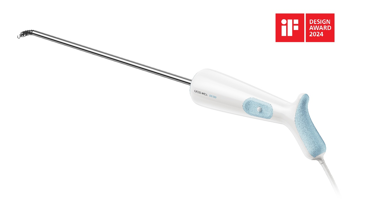 获奖产品“Cross Well DG100”是一款应用于外科手术的微型腹腔镜手术器械,设计作品由师生团队经过一年多的设计迭代完成。团队提出的轨迹球操作方式可实现器械头端360°旋转和90°弯曲,实现了即使在狭小的腹腔,医生不转动手腕也能精确控制钳口角度,缓解了医生手腕的疲劳,提升了手术安全性。设计对握把和操作体验进行了人机工效设计和优化,采用三管星形手柄,握把与手掌的紧密贴合,能减少手腕疲劳,确保长时间使用时的安全性、舒适性和稳定性。