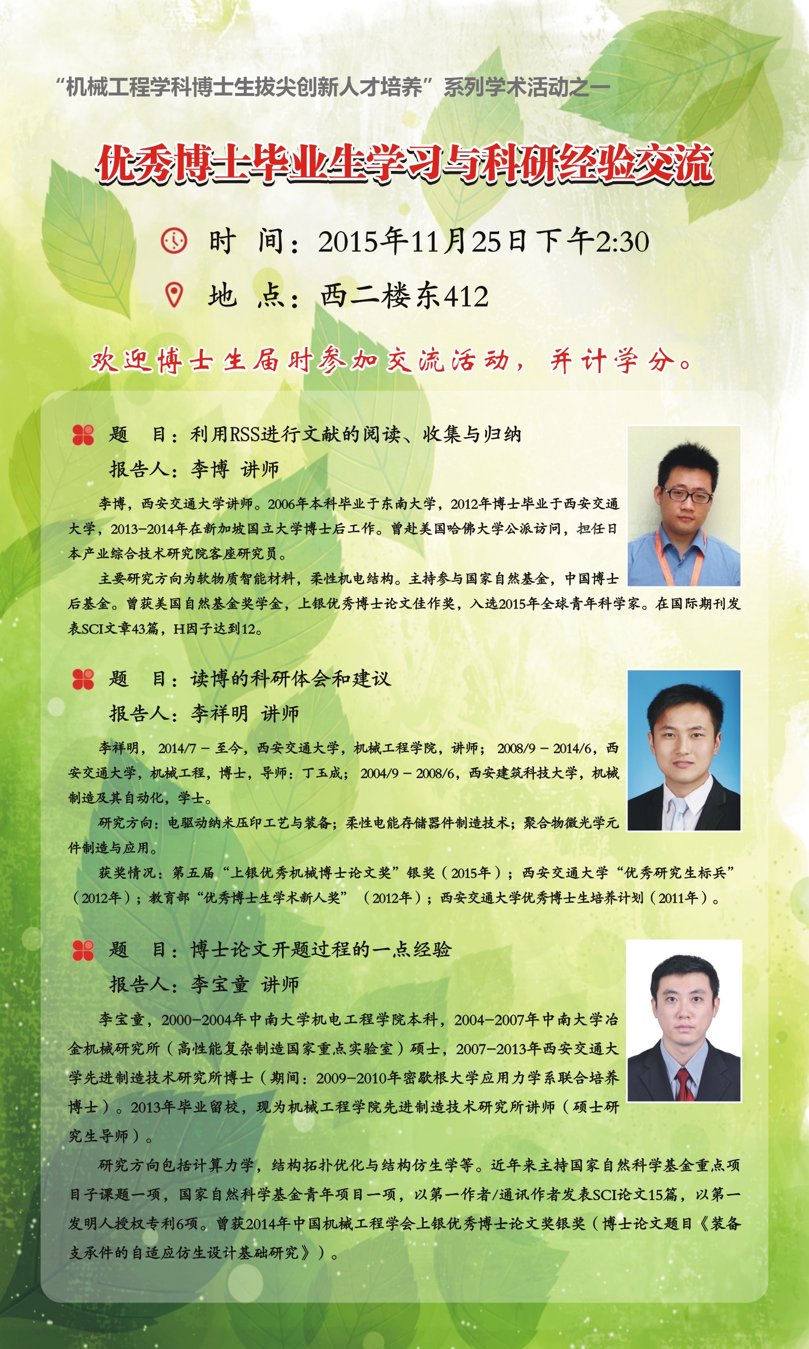 由机械工程学院组织的“机械工程学科博士生拔尖创新人才培养”系列学术活动之一安排如下: