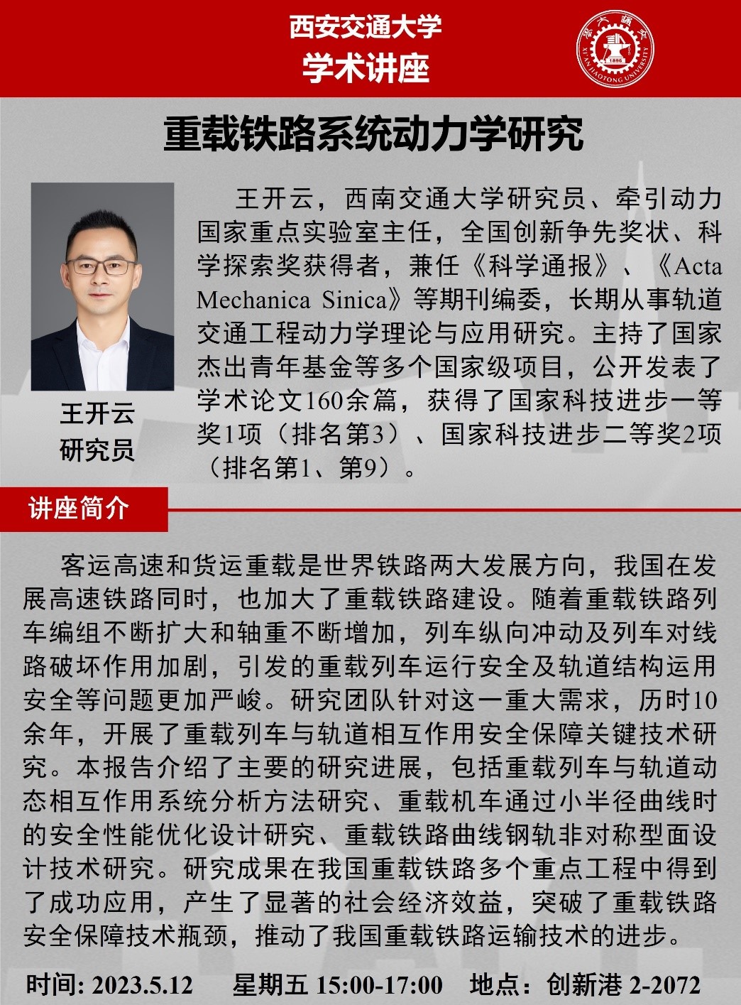 王开云,西南交通大学研究员、牵引动力国家重点实验室主任,全国创新争先奖状、科学探索奖获得者,兼任《科学通报》、《Acta Mechanica Sinica》等期刊编委,长期从事轨道交通工程动力学理论与应用研究。主持了国家杰出青年基金等多个国家级项目,公开发表了学术论文160余篇,获得了国家科技进步一等奖1项(排名第3)、国家科技进步二等奖2项(排名第1、第9)。