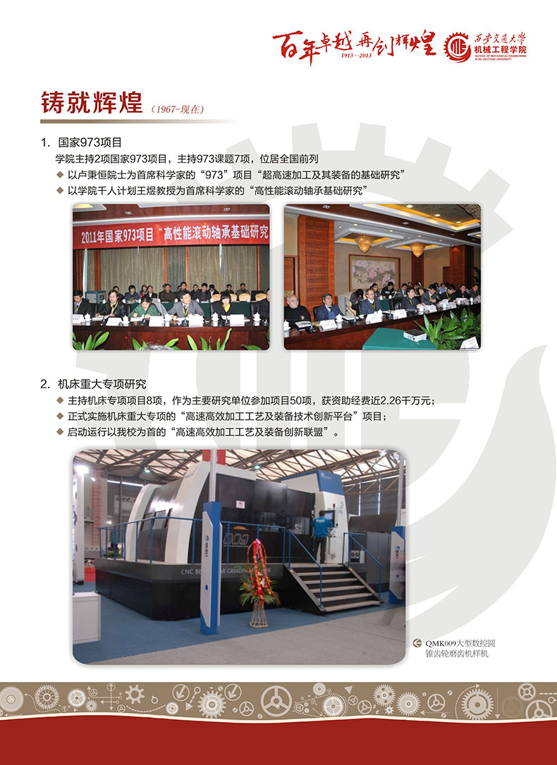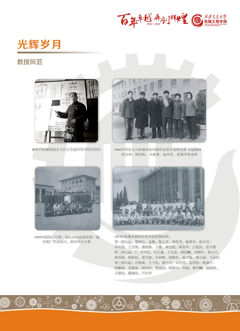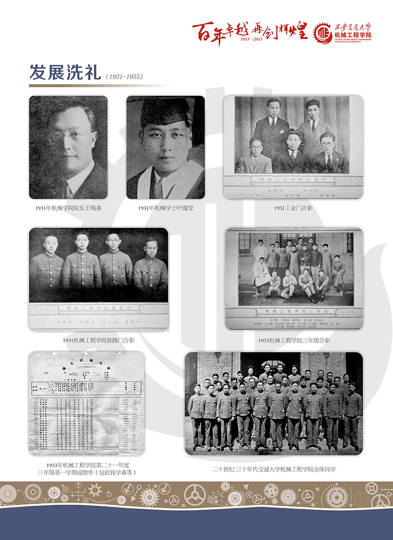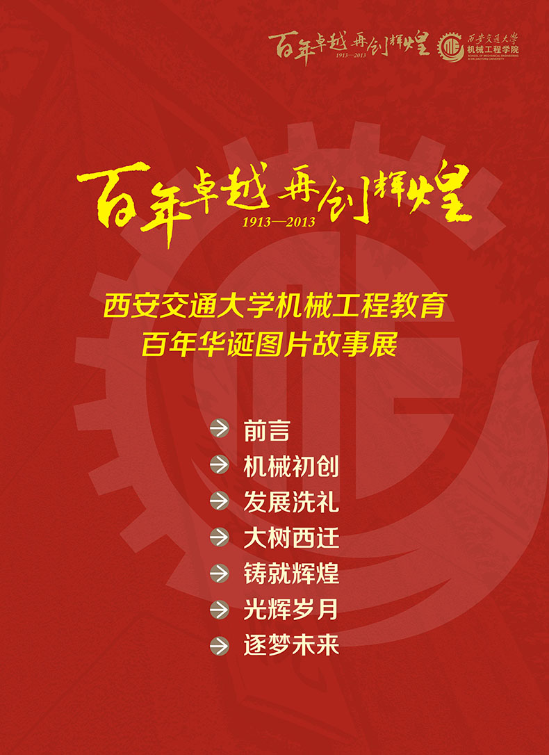 2013年4月5日,“百年卓越 再创辉煌”西安交通大学机械工程教育百年华诞图片故事展在交大博物馆拉开帷幕。展览是为庆祝交通大学机械工程教育百年华诞而特别举办,展览分前言、机械初创、发展洗礼、大树西迁、铸就辉煌、光辉岁月和逐梦未来7个部分,以图文并茂的方式对交通大学机械工程教育的百年发展史做了回顾,从教学、科研和社会服务等不同角度对西迁之后西安交通大学机械工程学科取得的辉煌做了展示,并对未来西安交通大学机械工程学院和机械工程学科的发展做了展望。