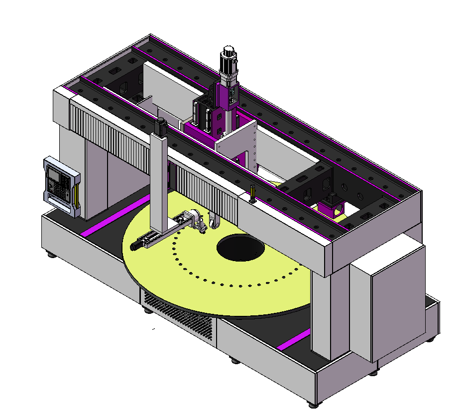 在原有铸件的基础上进行精加工。加工底座、立柱A、立柱B、横梁、Z轴滑块、X轴滑块A、X轴滑块B、共计8件,对加工面进行精加工,并钻孔以满足装配需求。导轨安装面需刮研。