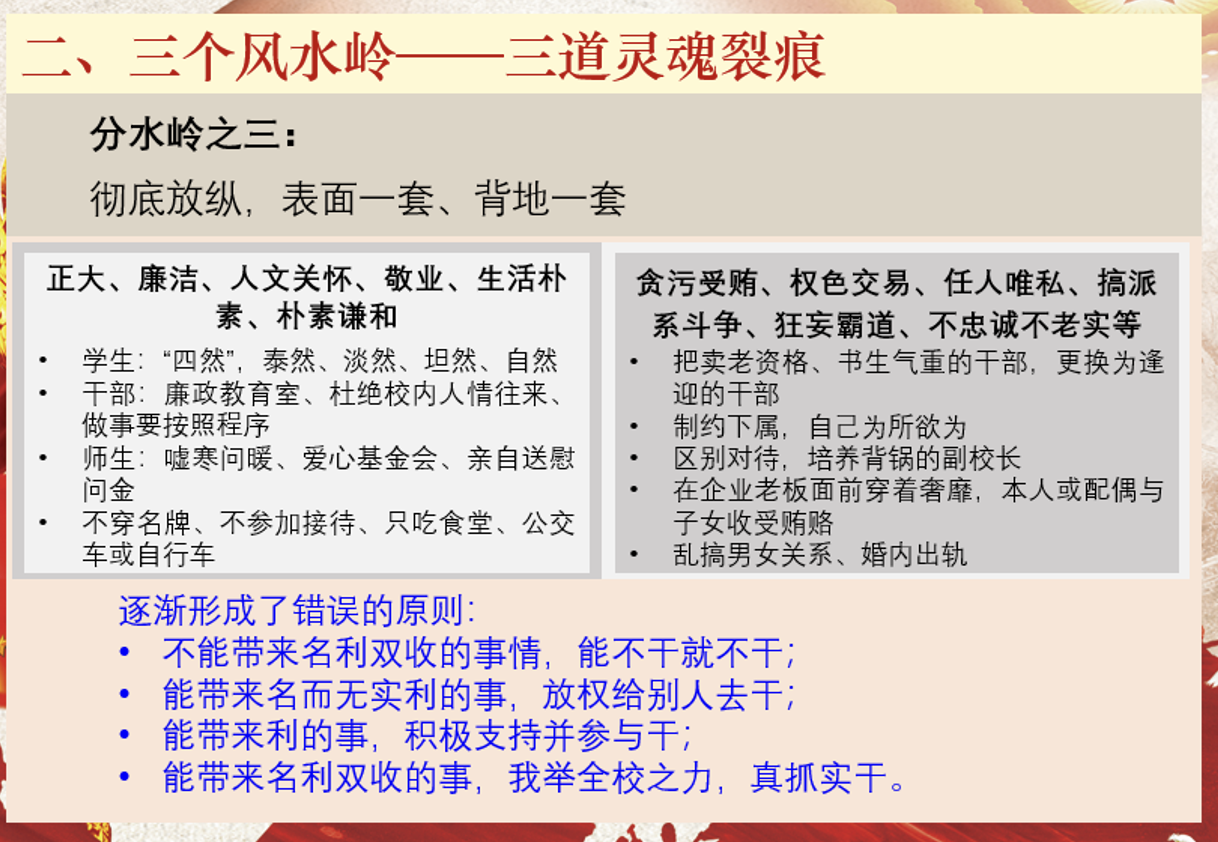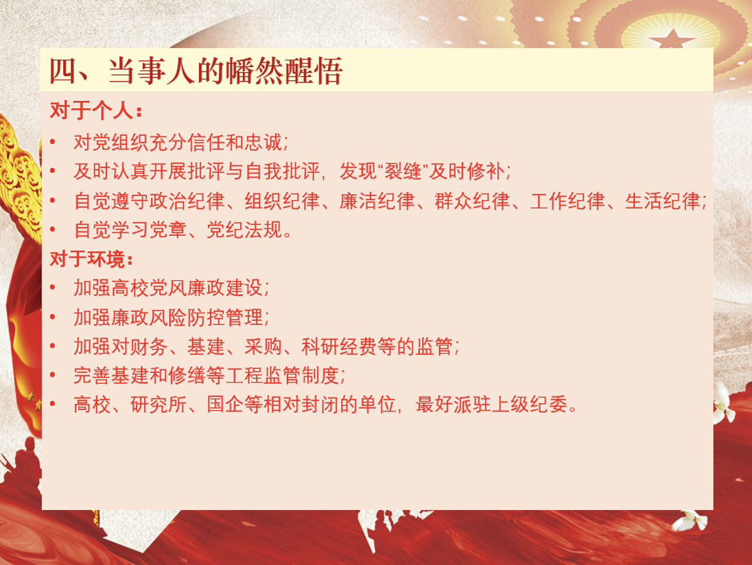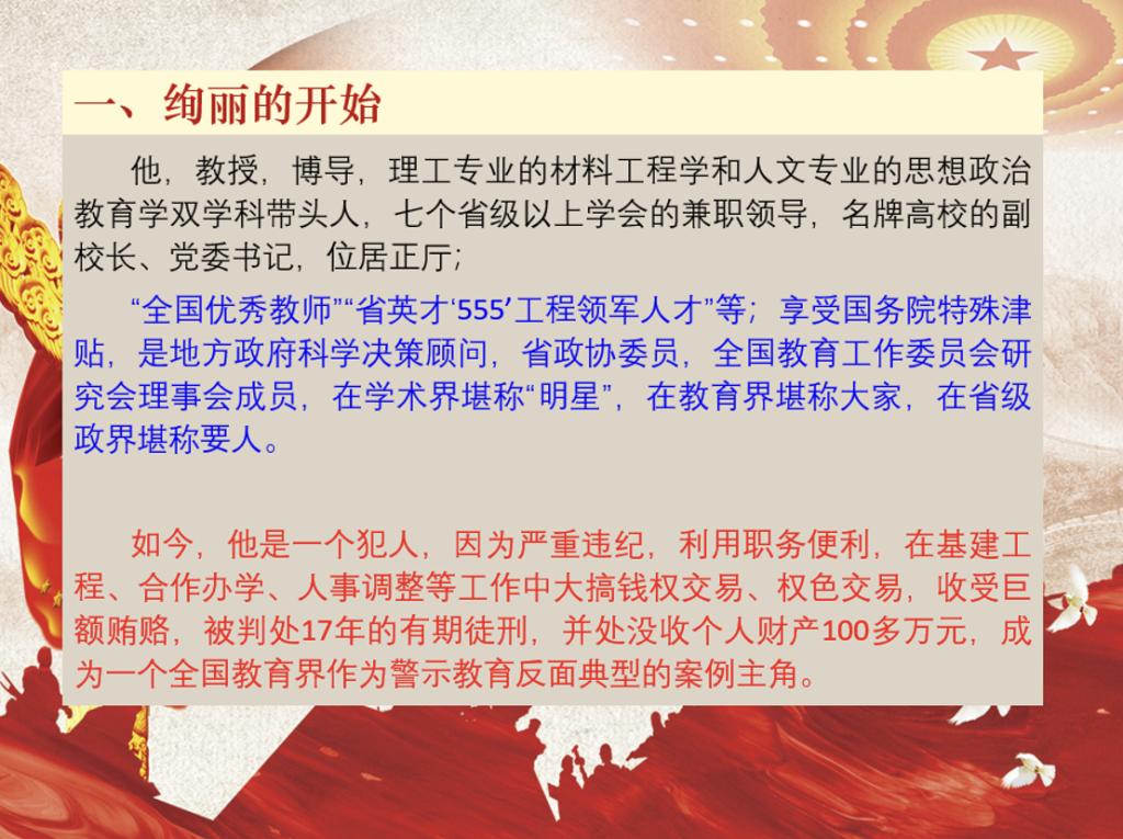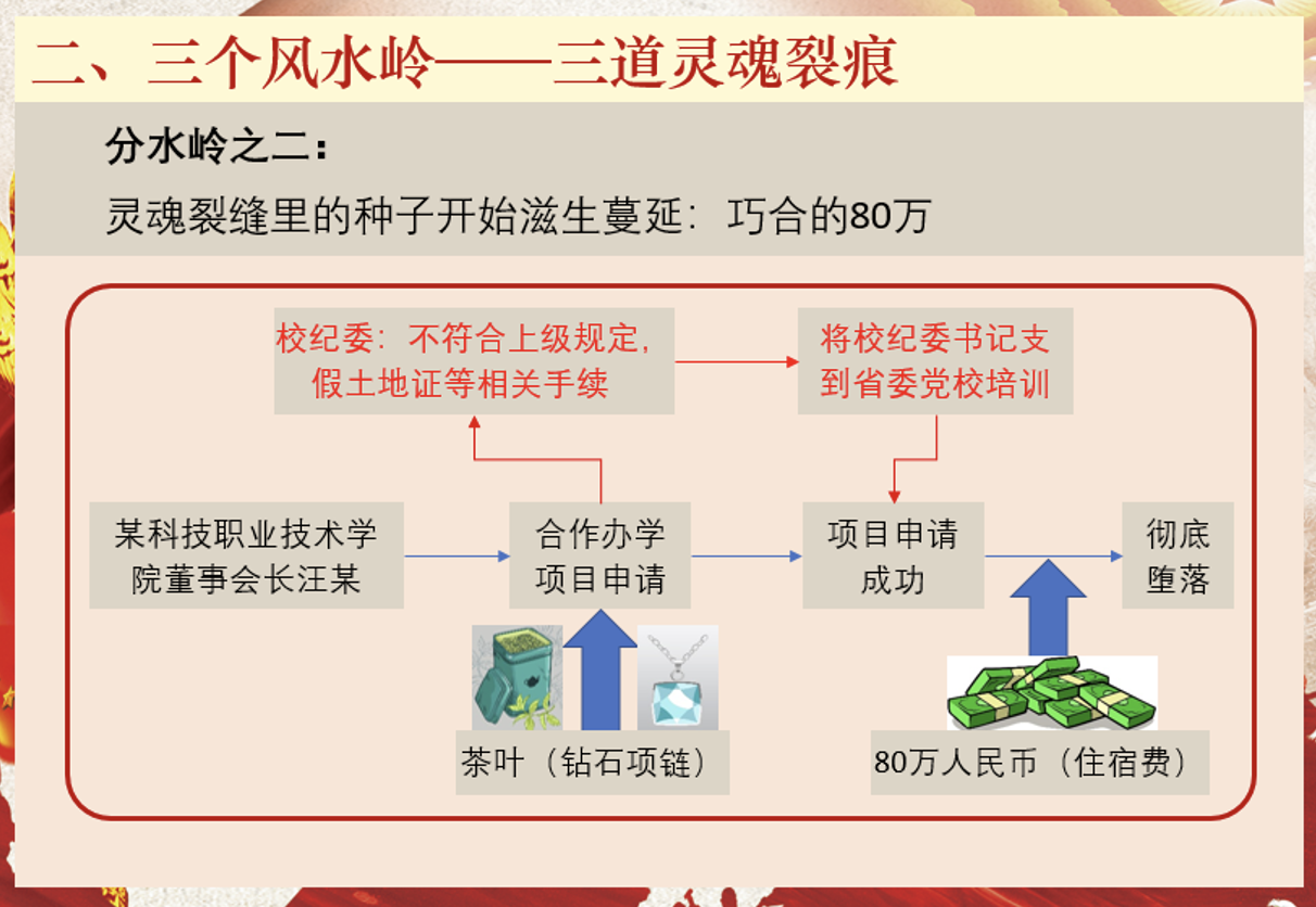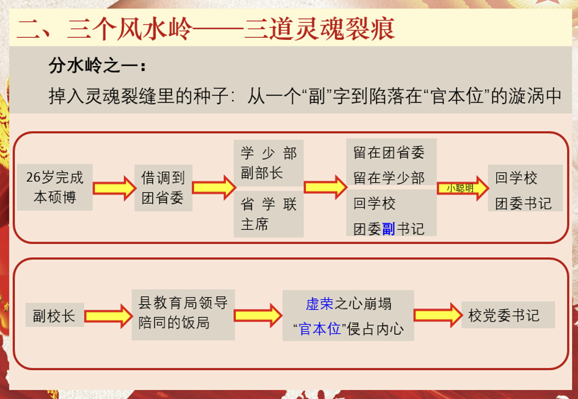 李志远同志详细分析了当事人从一开始对于仕途的痴迷而耍的小聪明,到在县教育局饭局过后的虚荣之心崩塌、原则失守,再到初尝受贿的“禁果”,到最后被双规的整个心态的变化。