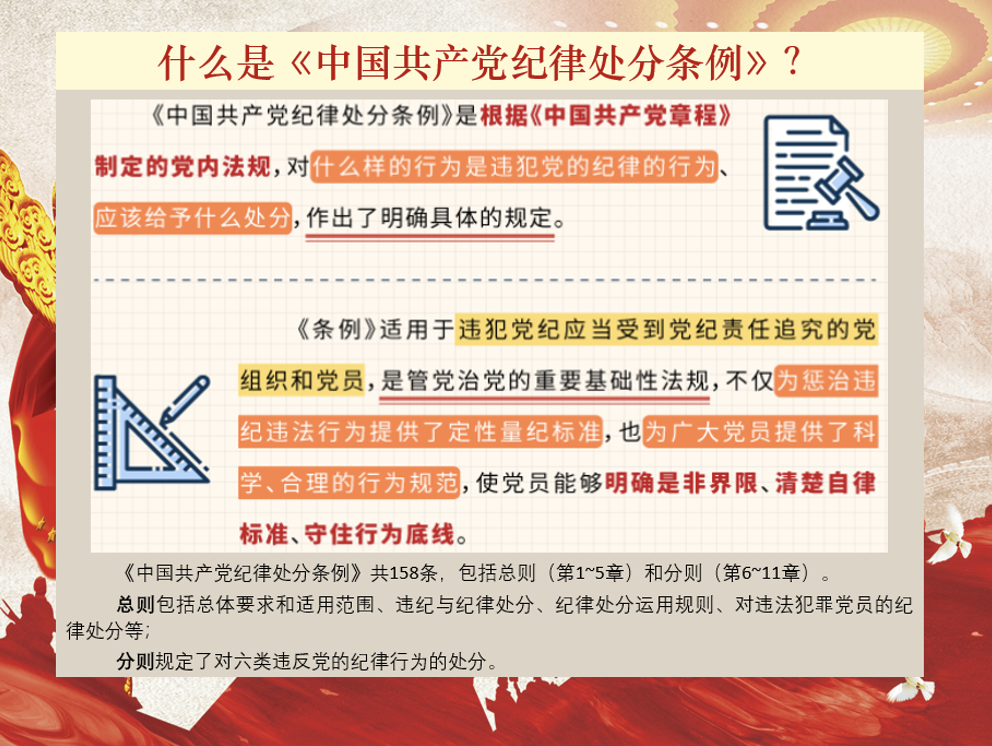 支部书记李志远同志首先介绍了《中国共产党纪律处分条例》的基本内容。《条例》是根据《党章》制定的党内法规,对什么样的行为是违犯党的纪律的行为、应该给予什么处分,作出了明确的规定。《条例》适用的对象是违犯党纪应当受到党纪责任追究的党组织和党员。