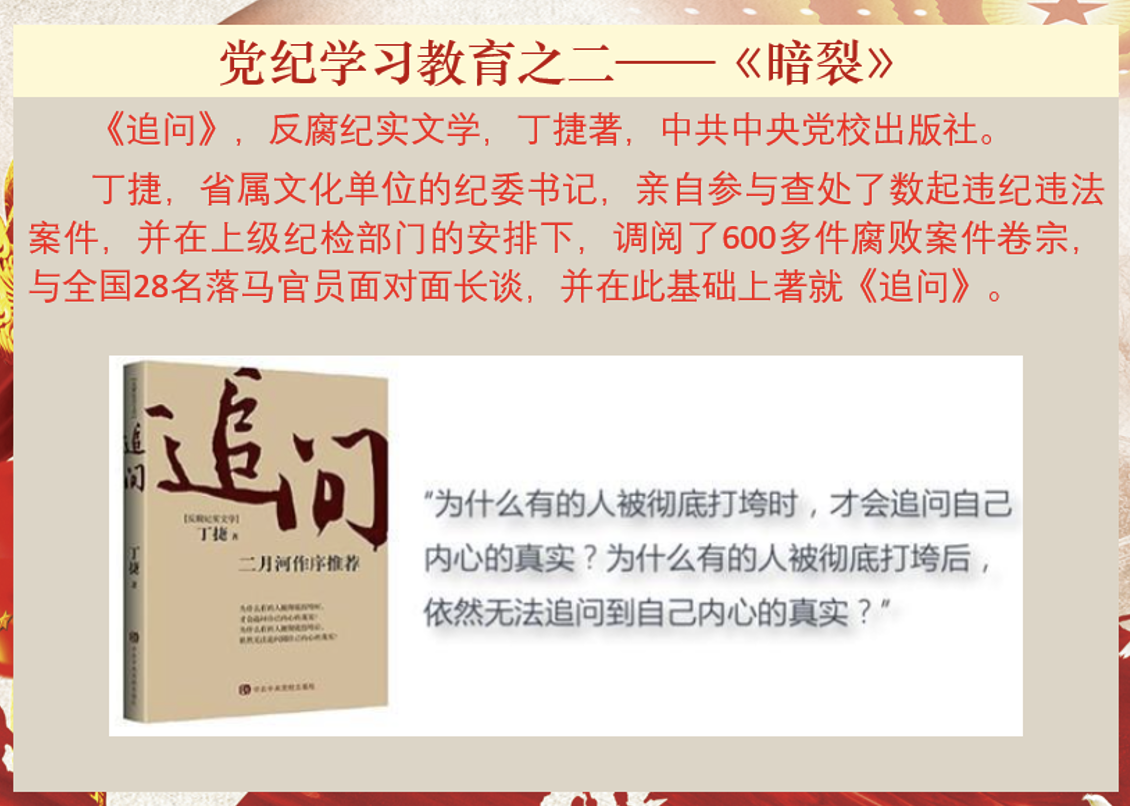 本期党课选择的内容来自于中共中央党校出版社出版的反腐纪实文学《追问》。《追问》中对于违犯党纪国法的党员干部的心路历程有较深的探讨,可使广大党员引以为戒。李志远同志系统介绍了该违纪典型案例《暗裂》的当事人是如何从青年科研英才堕落为阶下囚的心路历程。