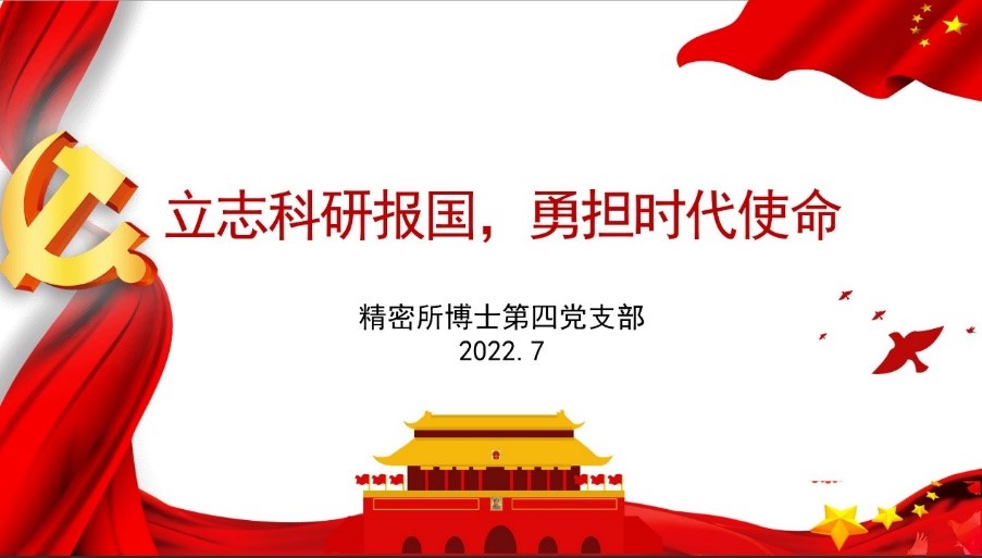 “科技自立自强是国家强盛之基、安全之要”。2022年7月29日下午,精密所博士第四支部书记王飞组织全体支部同志召开“立志科研报国 勇担时代使命”组织生活会,一起线上观看习近平总书记6月28日于湖北武汉的考察及讲话,并深刻讨论了观看感悟。