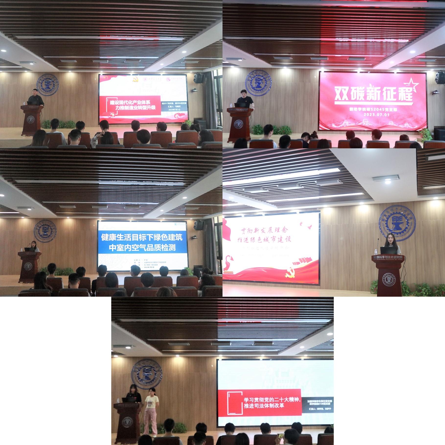 机械学院硕2017党支部的马畅欣同志代表硕2017党支部和硕2004党支部,从二十大报告中强调的“建设现代化产业体系”出发,围绕《“十四五”智能制造发展规划》解读了制造业未来的关键核心技术攻关方向,介绍了机械学院以“四个面向”为指引下推动制造业转型升级的相关成果与展望,并呼吁各支部共同推进党建引领下的党团支部工作与跨学科交流工作。能动学院硕2045党支部的刘泓炫同志对在“双碳”背景下产业、生产、能源低碳化的浪潮进行了解读,结合能动学科的研究特点,介绍了应对“双碳”目标的技术对策及未来展望方向。人居学院硕2178党支部的卢溜同志对绿色建筑的概念进行阐释,讲述了其探索引导、试行起步、快速成长、细化发展的四个发展阶段,以埃及典型房屋原型为案例,倡导在建筑设计中节能环保低碳理念的充分践行。人居学院硕2179党支部的那甫•其玛同志结合专业特色,从绿色建筑中建筑材料的使用出发,通过剖析西安交通大学七号楼中太阳能光伏装置与毛细空调的建筑设计,聚焦双碳课题,凝练出绿色建筑中环保材料应用的关键要素,提出了以二十大精神内涵为“核心”,以建筑设计、建筑材料创新为“助力器”,践行生态环保理念,促进学科交叉融合,推动双碳工作落地。医学部法医学院学生第五党支部的阎亭羽同志和药学院硕2135党支部的刘梦宁同志从司法体制改革含义、新时代司法体制改革的丰硕成果、党的二十大对司法体制改革的新要求等方面对党的二十大报告中关于司法体制改革的内容进行了介绍和解读。