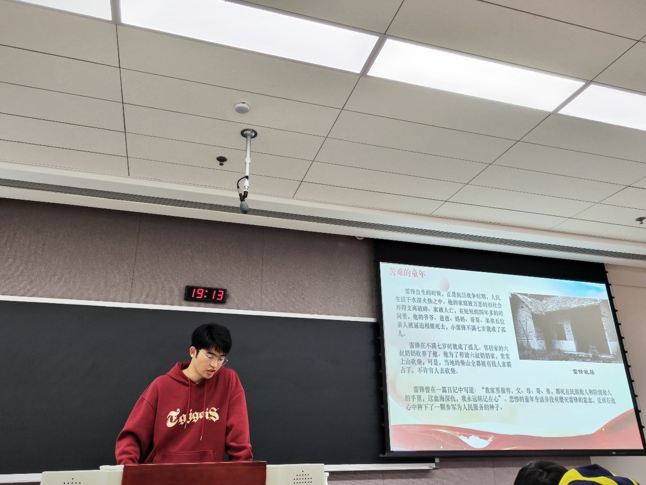 本次会议由支部成员薛冲同志和李晓凯同志组织。会议包括“雷锋同志人生经历”、“雷锋同志先进事迹”、“雷锋精神”、“向雷锋同志学习”四个部分。雷锋的一生,是把有限的生命投入到无限的为人民服务之中的一生。他刻苦学习马列主义、毛泽东思想,坚持理论联系实际,努力实践,具备了全心全意为人民服务的无私忘我的奉献精神。薛冲同志围绕“向雷锋同志学习”这一主题带领支部成员深刻学习雷锋精神。