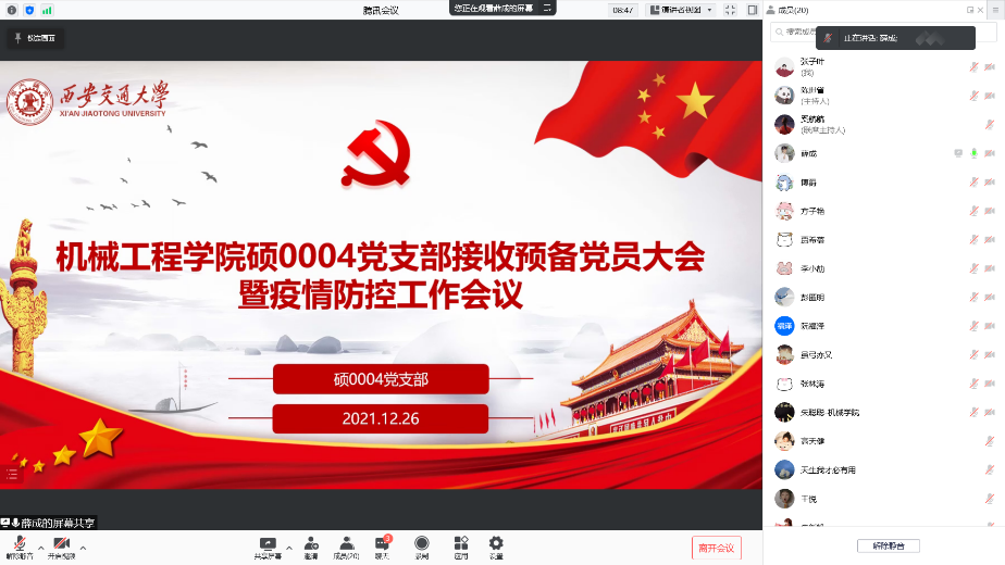 根据硕0004党支部发展党员工作计划,经征求党员和群众意见、支部委员会审查同意,12月26日晚,机械工程学院硕0004党支部线上召开接收预备党员大会。同时,针对近期西安日趋严峻的疫情防控态势,党支部根据学校、学院要求,向与会成员传达学校、学院疫情防控工作会议精神,部署安排支部内疫情防控工作。