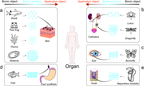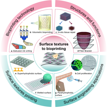 近年来,3D打印技术在生物制造领域取得了显著进展,推动了包括组织工程、再生医学、药物输送以及个性化医疗设备在内的多个生物医学应用的快速发展。这些进步使得科学家们能够精确地制造出与自然界功能类似的复杂结构,从而更好地满足医学和工程的需求。西安交通大学机械工程学院与美国普渡大学西拉法叶分校的研究团队上发表了一项创新性研究,展示了如何通过3D打印技术制备具备多功能特性的生物结构,为组织工程及再生医学的应用开辟了新的可能。利用增材制造技术,设计并制造出具有仿生特性的生物结构,这些结构模仿了自然界中各种功能性生物材料,例如表面超疏水性、各向异性和机械强化等功能,进而用于植入器官和生物医学设备的制备。通过仿生表面和界面结构的优化设计,3D打印技术为植入体进一步提升了与人体的相容性及生物力学性能。