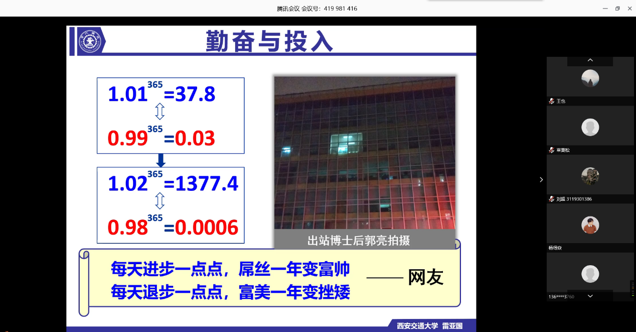 其次,雷老师分别从阳光心态、勤奋与投入、主动出击、精益求精、独立思考这五个方面,以自身导师及学生为例,脱离假大空的说教,用身边实例使同学们感受到榜样的力量。在阳光心态部分,雷亚国教授以自己导师何正嘉教授以及自己第一位博士生李乃鹏为例,劝诫大家保持屡败屡战的良好心态。在勤奋与投入部分,雷亚国教授分别以1.01的365次方与0.99的365次方进行对比,勉励同学。在主动出击部分,雷教授将自己导师的话拿出来与同学们分享。“读研不是为了一纸文凭,一段学历,而是学识,学时获取贵在主动”。在精益求精部分,雷亚国老师以同学生探讨论文中数字与单位间的空格为例,强调注重细节。在独立思考部分,雷亚国老师以博士生选择深造导师为例,强调自我思考的重要性。