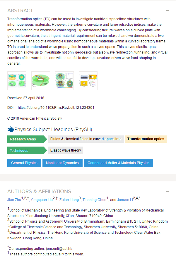 相关研究成果以“Elastic Waves in Curved Space: Mimicking a Wormhole”为题,近日在国际权威期刊Physical Review Letters上在线发表。西安交通大学机械工程学院朱建为该论文的第一作者,西安交通大学机械工程学院为该论文第一作者和第一单位。