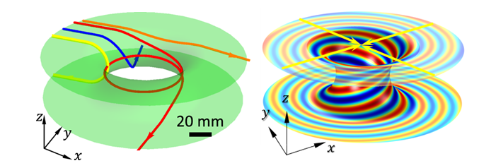 近日,西安交通大学陈天宁课题组与英国伯明翰大学和香港科技大学Jensen Li课题组合作提出采用利用变换理论来研究弯曲时空,建立了弯曲时空的理论变换模型及物理方程。利用纯几何曲率的方法来构造满足变换媒介所需要的材料参数要求,以弹性波在弯曲结构中的传播为研究平台,研究了弹性波在类比虫洞结构中波动特性、遂穿效应、焦散特性等,研究结果表明:弯曲时空中的波传播特性可以通过变换理论用更加简单的模型来研究;所设计的弹性波虫洞结构在虫洞半径大于某个阈值的时候,对波传播具有100%的遂穿效果;入射点和焦散线的尖端点满足特定的成像公式;弹性波作为实现平台可为弹性波在复杂结构中的传播提供一种新的思路。该研究方法和手段可为拓展到声学、光学等其他研究领域,如弯曲空间的波导、表面声传感等。