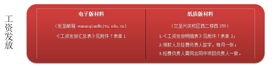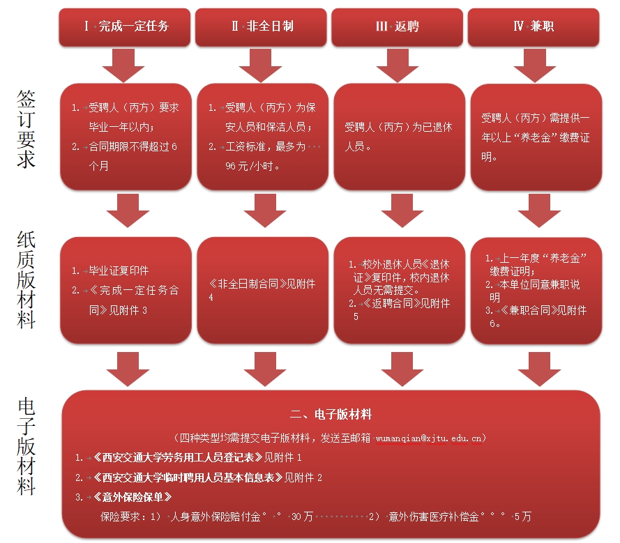“劳务用工”合同可与四类人员签订,即毕业一年内应届生,保安/保洁人员,退休人员及其他人员。具体签订方式及说明见下图。每月5日前办理合同(12月停办当月合同);每月10日前提交工资发放表,次月初工资到账。